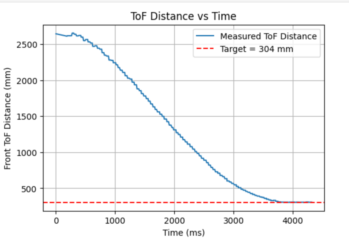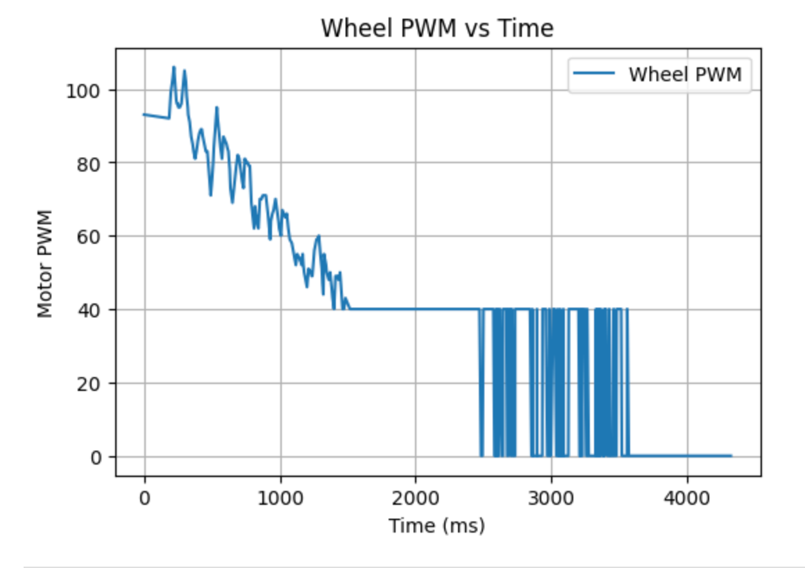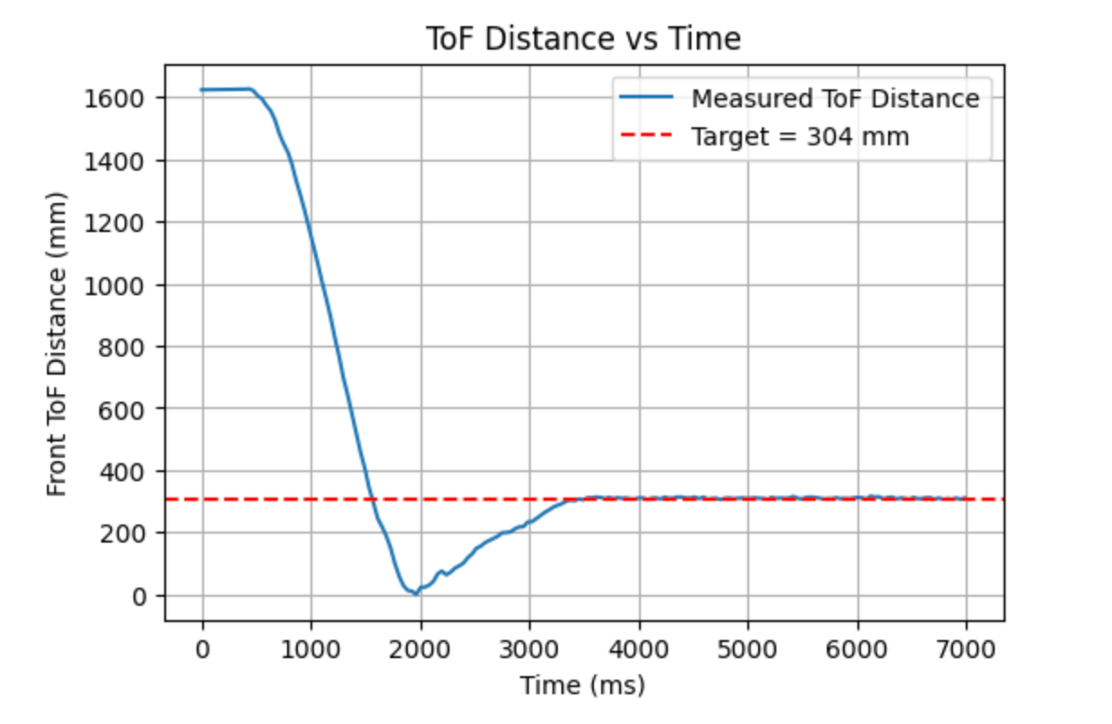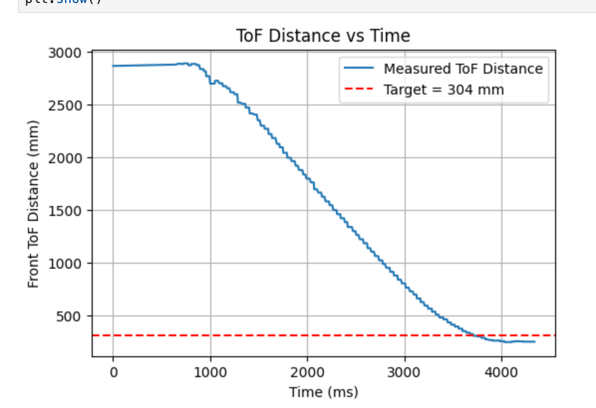 In this experiment, I had the robot move in a straight line toward the wall at a fixed motor input, while simultaneously recording the ToF distance, timestamps, and motor input data. Since the output of the left and right wheels was not exactly the same, I set the base PWM to 130 and applied compensation to the left wheel. To prevent the robot from colliding with the wall, it automatically stopped when the ToF reading approached 1000 mm.