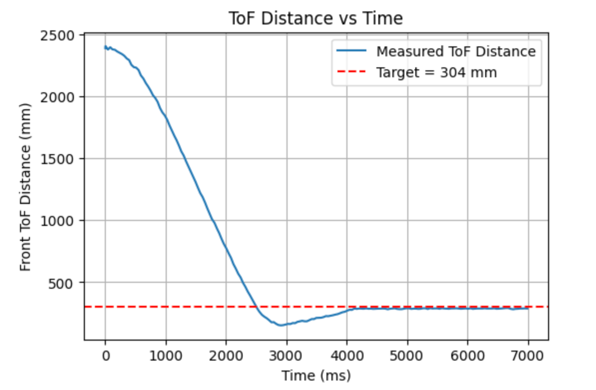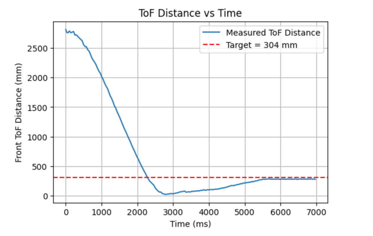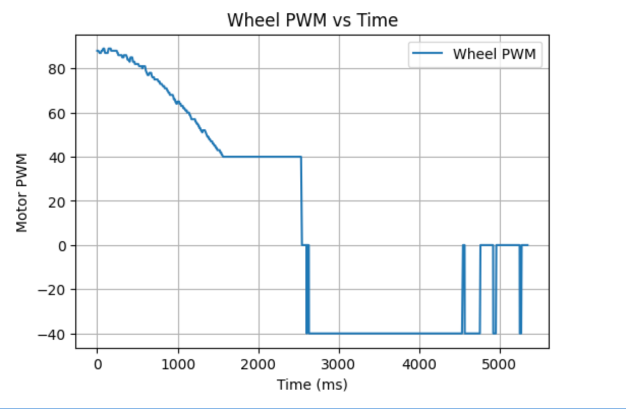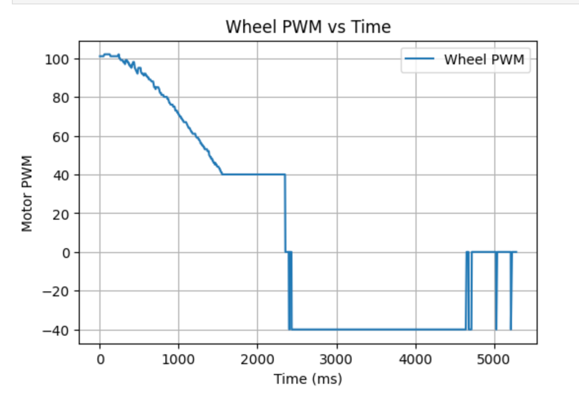 In this experiment, I had the robot move in a straight line toward the wall at a fixed motor input, while simultaneously recording the ToF distance, timestamps, and motor input data. Since the output of the left and right wheels was not exactly the same, I set the base PWM to 130 and applied compensation to the left wheel. To prevent the robot from colliding with the wall, it automatically stopped when the ToF reading approached 1000 mm.