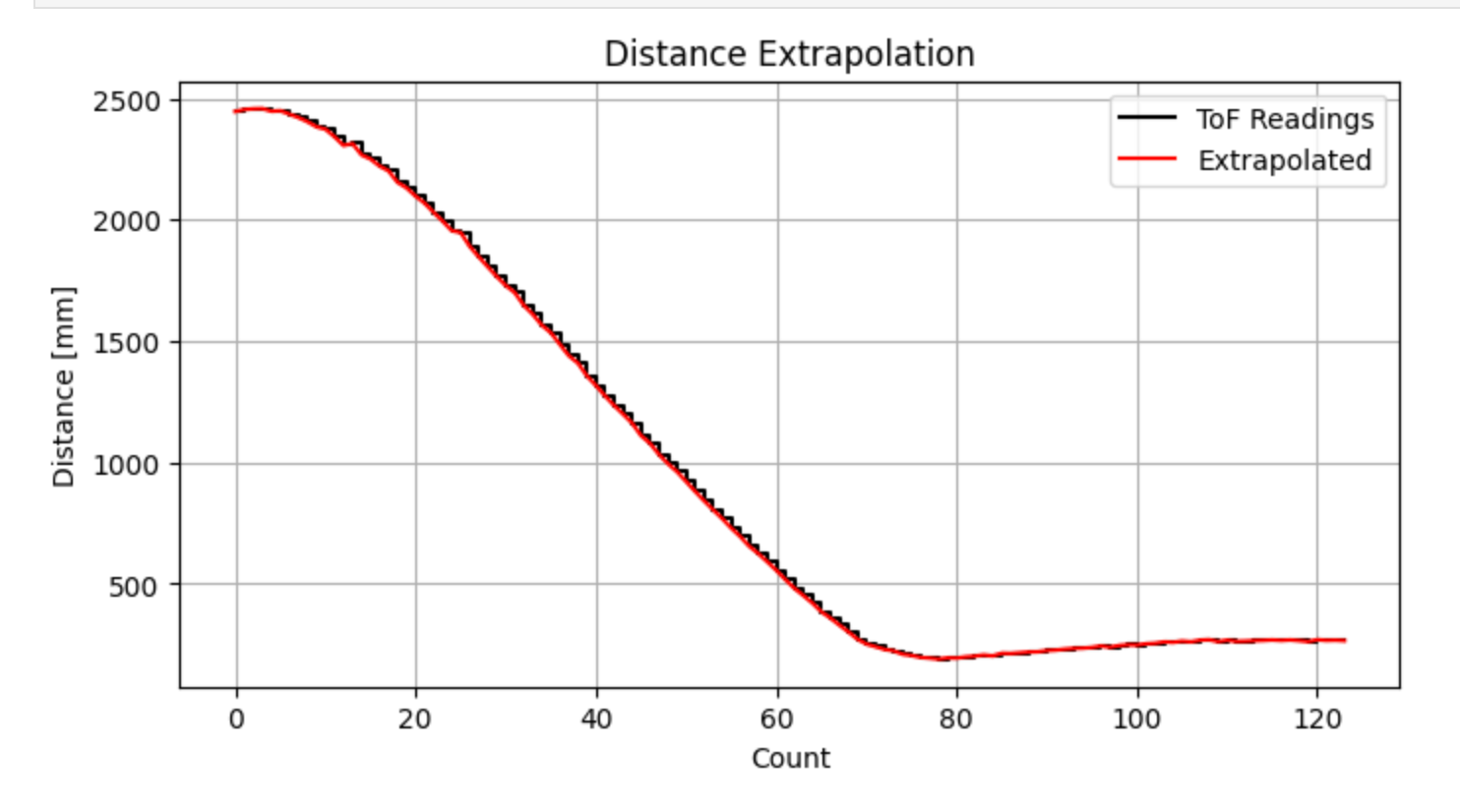 Then, I used the initialized \( \mathbf{x} \) and \( \Sigma \) from Part 2 as the initial values of the filter and ran the Kalman Filter point by point on the step response data. Since the step input in this experiment was set to 130, the motor input was scaled as \( u/130 \) at each step. Because the position in the state is defined as negative distance, it was converted back to a positive distance when saving the results so that it could be directly compared with the raw ToF data.